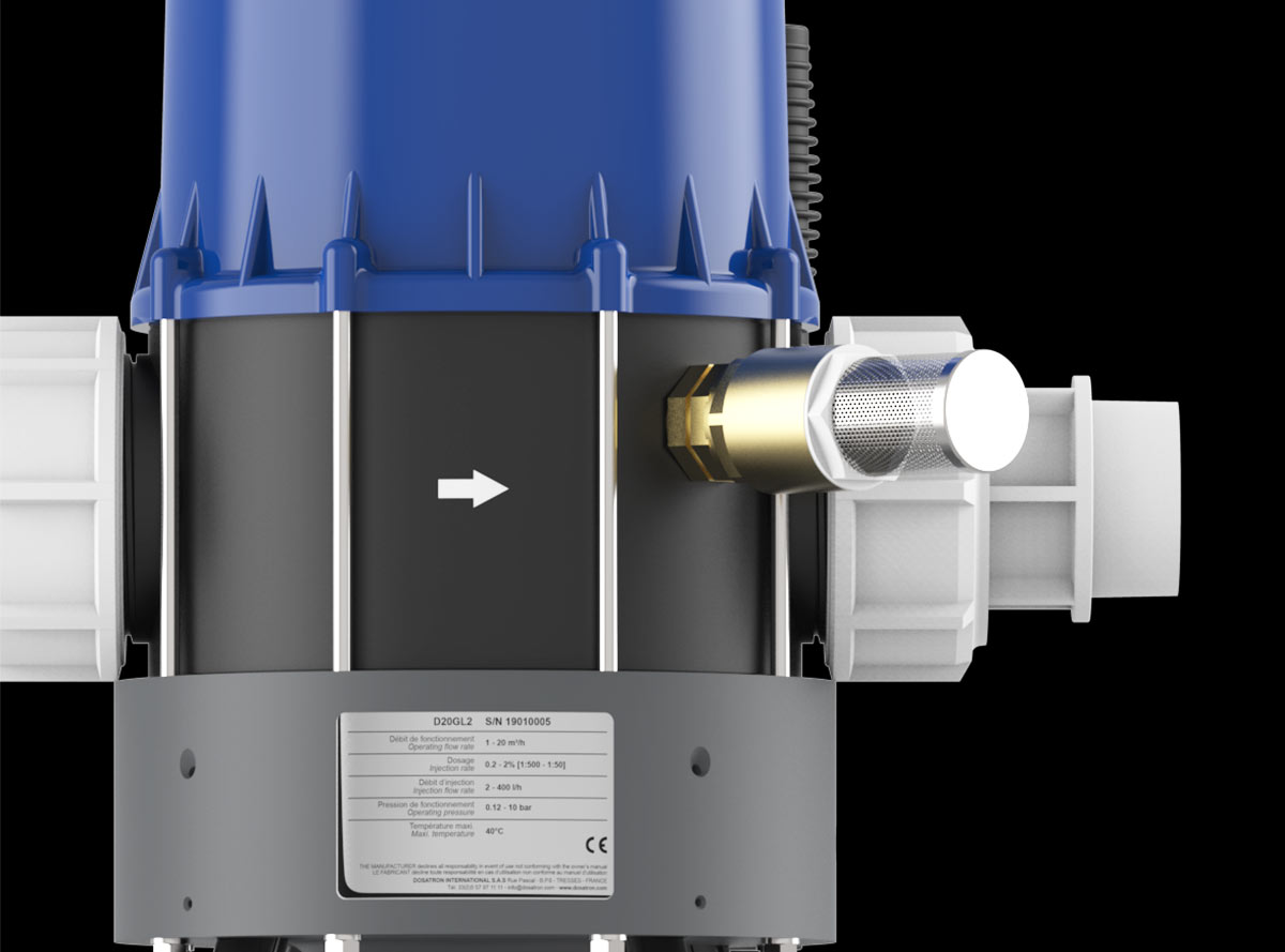 Proportionaldosierer der Serie D20 von Dosatron bieten eine hohe Förderleistung bei flexibler Dosierung. Die Dosierer arbeiten stromlos und werden allein durch das durchfließende Wasser angetrieben. Der Motor treibt einen Kolben in der Dosierverstellung an und fördert auf diese Weise das zu dosierende Medium. Durch den rein mengenproportionalen Antrieb arbeiten die Dosatron Dosierer auch bei Durchflussschwankungen sehr präzise und zuverlässig. Die gewünschte Dosierrate kann an der Dosierverstellung sehr einfach verändert werden.