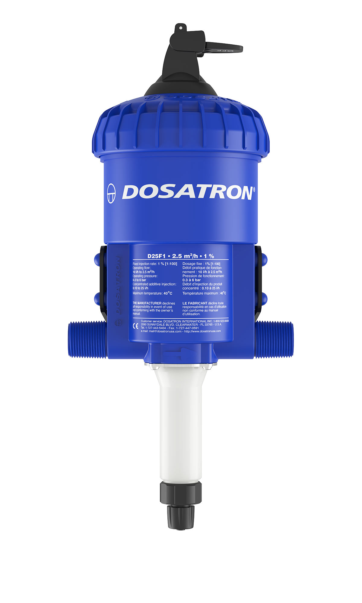Proportionaldosierer der Serie D25 von Dosatron zeichnen sich durch hohe Flexibilität und Anpassbarkeit aus. Es kann eine breite Palette von Dosierverhältnissen dargestellt werden, was sie für verschiedenste Anwendungen qualifiziert. Durch den rein mengenproportionalen Antrieb arbeiten die Dosatron Dosierer auch bei Durchflussschwankungen sehr präzise und zuverlässig. Die gewünschte Dosierrate kann an der Dosierverstellung sehr einfach verändert werden.