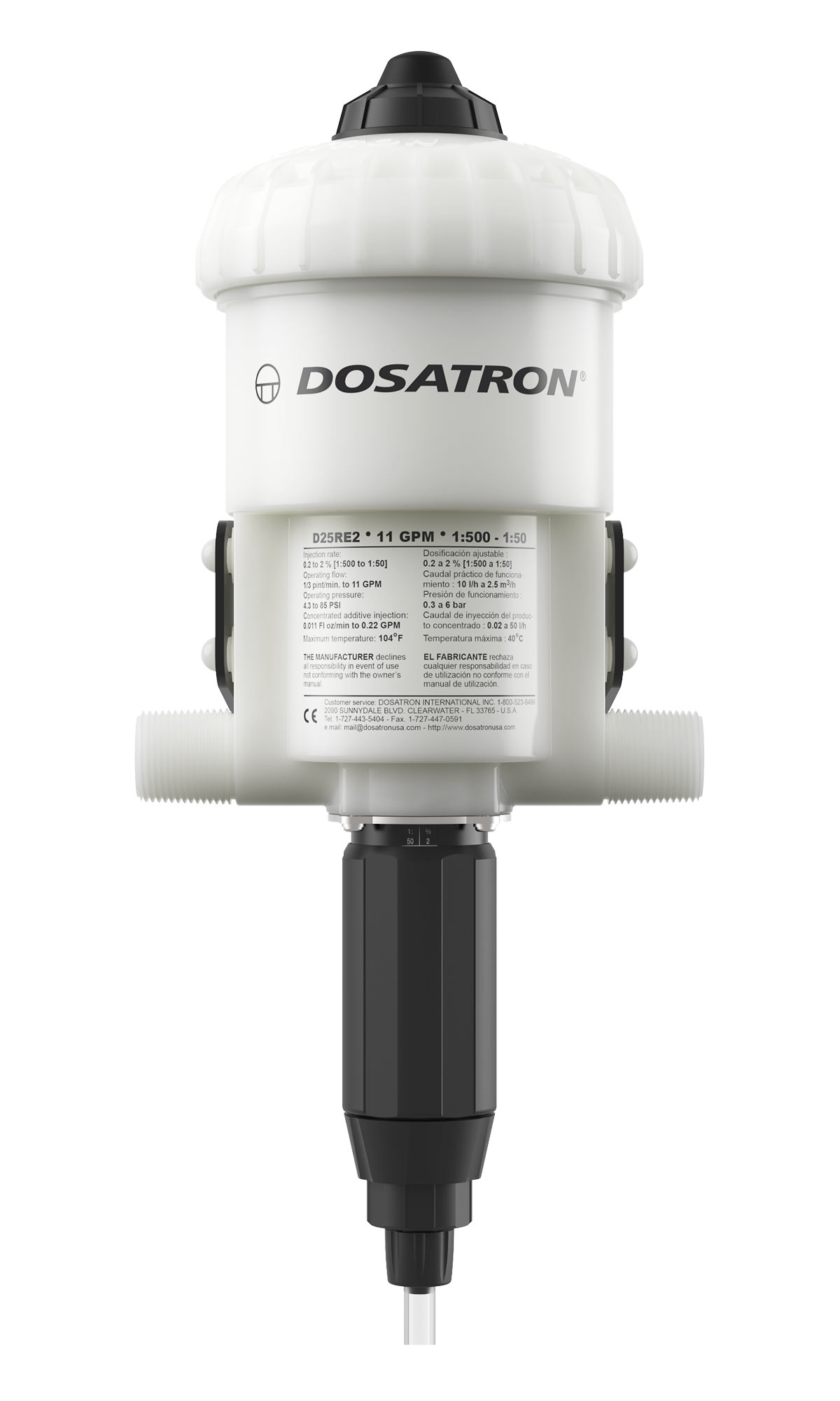 Proportionaldosierer der Serie D25 von Dosatron zeichnen sich durch hohe Flexibilität und Anpassbarkeit aus. Es kann eine breite Palette von Dosierverhältnissen dargestellt werden, was sie für verschiedenste Anwendungen qualifiziert. Durch den rein mengenproportionalen Antrieb arbeiten die Dosatron Dosierer auch bei Durchflussschwankungen sehr präzise und zuverlässig. Die gewünschte Dosierrate kann an der Dosierverstellung sehr einfach verändert werden.